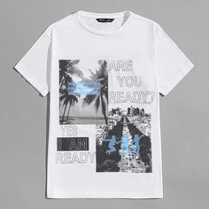 Принт с надписью спереди, графичный принт, вышитый логотип на рукаве, круглый вырез и короткие рукава. Цвет: белый.