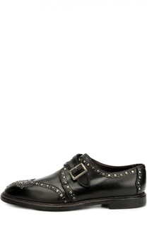 Черные кожаные монки с заклепками от Dolce & Gabbana. Застежка на пряжке, закругленный носок, плоская подошва.