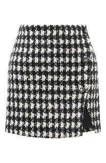 Короткая юбка-трапеция с посадкой на талии от бренда Self-Portrait. Украшена асимметричным воланом спереди, который продолжается по нижнему краю. Сшита из белой ткани, узор в виде крупной клетки из тонких черных полос. В качестве пояса – черная лента. ...