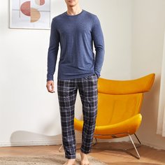 Свободный мужской комплект одежды прямого кроя из смешанной ткани (70% хлопок, 30% полиэстер). Лонгслив с V-образным вырезом и длинным рукавом украшен термоаппликацией на левой груди. Брюки в клетку тартан с карманами фиксируются при помощи внутренней р...