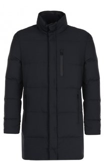 Темно-синяя стеганая куртка с тремя карманами сшита из комбинации матовой мягкой кожи и плотного шерстяного текстиля с влагоотталкивающей пропиткой. В воротник-стойку прячется тонкий капюшон. Модель, утепленная отборным пухом, вошла в осенне-зимнюю колл...