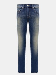 "деним, эффект поношенности, эффект ""делаве"", логотип, одноцветное изделие, классический цвет, классическая посадка на талии, застежка спереди, молния и пуговицы, множество карманов, стрейч"