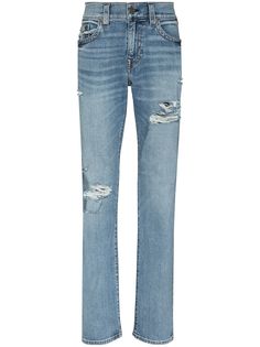 Джинсы прямого кроя с эффектом потертости от True Religion. Кожаная заплатка с логотипом сзади, выцветший эффект, пояс с петлями для ремня, ширинка на молнии с пуговицей, классическая пятикарманная модель и стандартная длина. Цвет: синий.