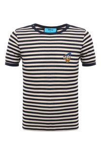 Футболка из легкого хлопкового трикотажа с сетчатым узором вошла в капсульную коллекцию, созданную в сотрудничестве с командой Disney — об этом напоминает вышитый патч в виде Дональда Дака в бескозырке. Поддерживают морскую стилистику горизонтальные син...