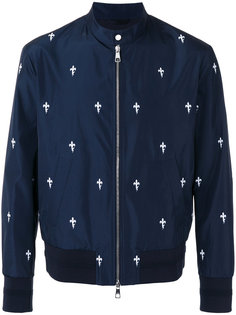 Темно-синяя хлопковая куртка бомбер с принтом от Neil Barrett. Застежка на молнии спереди, длинные рукава, подол и манжеты в рубчик.