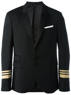 Пиджак с отделкой в полоску от Neil Barrett. Застежка на пуговицах спереди, зазубренные лацканы, передние карманы с клапанами, нагрудный карман, отделка в рубчик, узор в полоску, двойная шлица сзади, цельная подкладка и полоски сбоку. Цвет: черный.