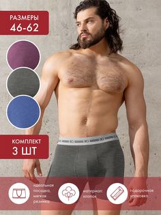 Хлопок-100%, широкий размерный ряд, классические боксеры с вертикальными плоскими швами, идеальны для ежедневной носки, эластичный пояс, свободный крой, 3 штуки в упаковке, при первой стирке возможно незначительное окрашивание воды для темных цветов. С...