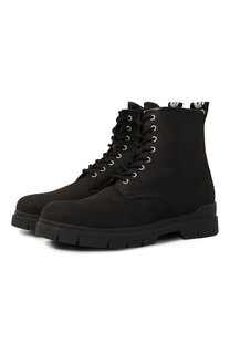 Высокие ботинки с усиленным задником сшили из прочной замши. Пару с тисненым логотипом на язычке поставили на широкую подошву с устойчивым протектором. Чтобы обувь было удобнее надевать, на голенище с кожаным кантом по краю предусмотрели текстильную пет...