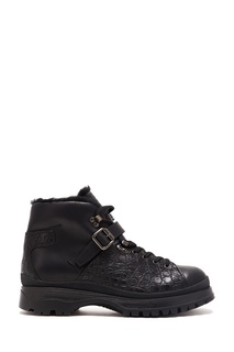Черные ботинки выполнены из натуральной кожи и дополнены меховой подкладкой. Корпус украшен декоративными ремешками и вставками из натуральной кожи каймана. Высокая подошва с протектором, тисненый логотип на язычке. Состав: верх: кожа