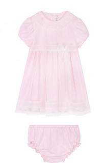Розовое платье с короткими рукавами выполнено из тонкого легкого хлопка. Структура волокон хорошо пропускает воздух и отводит влагу, позволяя телу дышать. Защипы на передней полочке создают мягкие драпировки. Широкие ленты завязываются бантами на плечах...
