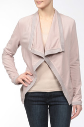 Эффектный пиджак в стиле casual с отложным воротником и длинными рукавами. Модель дополнена застежкой на косую молнию. Приталенный силуэт. Сзади имеется небольшая шлица.