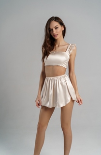 Эффектная пижама с шортиками, который нежно скользит по телу, слегка охлаждая кожу и снимая напряжение во время сна. Топ на резинке декорирован сборкой по нижней и верхней части. Укороченный крой топа уравновешивается посадкой воздушных шорт на резинке ...