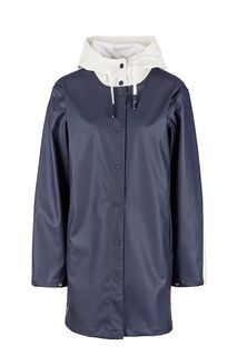 Сочетание двух оттенков, классический капюшон, длинные рукава, застежка на кнопки, серебристая фурнитура, два кармана с клапанами по бокам и кулиска на талии. Цвет: синий.
