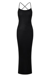 Черное макси-платье с открытой спиной и узкими перекрещивающимися бретелями плавно струится вдоль силуэта, создавая чувственный вечерний образ. Модель с глубоким V-образным вырезом сшита из шелковистого эластичного текстиля, полностью покрытого миниатюр...