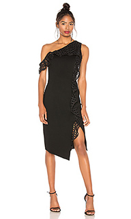 Платье прилегающего силуэта с открытыми плечами и крупными оборками, выполненное из эко кожи.