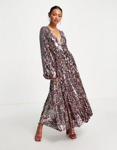 Струящаяся ткань, Дизайн миди, Расклешенный фасон, Набивной рисунок, Цветочный принт, V-образный вырез горловины с запáхом, Длинные рукава с пуговицами на манжетах, Пояс регулируется шнуром, Изделия с отметкой Committed изготовлены с использованием экол...