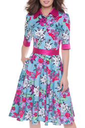 Роскошное платье миди-длины из красивой ткани хлопок-стрейч. Верх платья украшает контрастный воротник, переходящий в планку по переду из основной ткани. Линию талии подчеркивает съемный пояс в тон воротника и манжет на рукаве 3/4. Великолепная юбка в к...