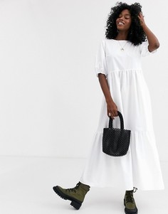Платье миди ASOS DESIGN Из подборки экологичной моды Косой воротник Застежка на пуговицы Длинные рукавам Манжеты на пуговицах Открытые швы Узкий крой Более свободный крой в области бедер