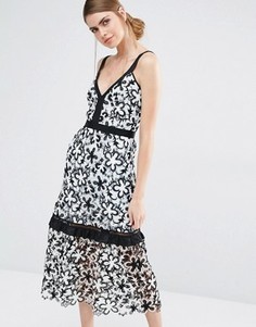Платье миди с кружевными вставками от Self-Portrait. Расклешенный силуэт, круглый вырез под горло, застежка на молнии сзади, модель без рукавов, приталенный крой и средней длины.