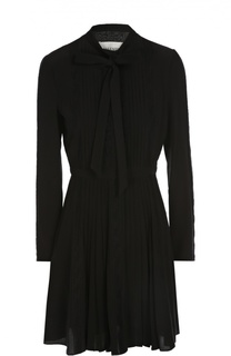 Короткое платье с длинными рукавами и воротником аскот, вошло в осенне-зимнюю коллекцию бренда, основанного Валентино Гаравани. Приталенная модель из черной шелковой ткани украшена плиссировкой с кружевом. Наши стилисты советуют сочетать с черными туфля...