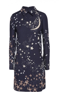 Тёмно-синее платье из шёлкового микса с космическим принтом от Valentino. Круглый вырез, прозрачные панели, задняя застёжка на пуговице, длинные рукава.