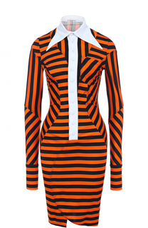 Платье-рубашка вошло в весенне-летнюю коллекцию марки, основанной Юбером де Живанши. Модель из мягкого эластичного текстиля в черную и оранжевую полоску дополнена множеством вытачек, поэтому садится точно по фигуре. Планка с крупными пуговицами и острок...