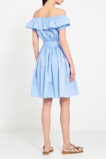 Хлопковое платье-миди Miu Miu украшено тонкой белой полоской на голубом фоне. Асимметричная приталенная модель на одно плечо. По линии верха крупная оборка с мелкими складками. Пришивной пояс, расклешенный подол с широкими складками. Состав: 100% ХЛОПОК