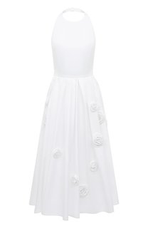 Кипенно-белое приталенное платье с открытой спиной и облегающим лифом сшито из тонкого хлопкового поплина, хорошо пропускающего воздух. На расклешенном подоле — объемные аппликации-розы, созданные Миуччей Прадой по мотивам старинных украшений. Легкая од...