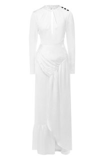 Длинное белоснежное платье из межсезонной коллекции 2021 года стало выглядеть наряднее за счет декора. Дизайнер марки украсил линию реглан растительной аппликацией из сверкающих полупрозрачных кристаллов. Для пошива модели с завышенной талией и пуговице...