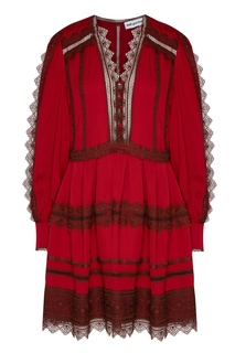 Платье со сборками от Self-Portrait. V-образная горловина, длинные рукава, задняя застежка на пуговице, приталенный крой, средней длины и закруглённый подол с кружевом. Цвет: красный.