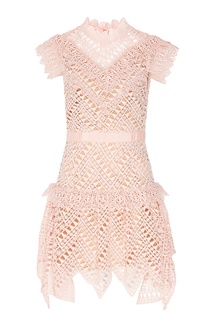 Коктейльное мини-платье из розового кружева от Self-Portrait. Полупрозрачное ажурное полотно из круглых элементов, украшенных цветами, внизу – подкладка бежевого цвета. Верх с глубоким квадратным вырезом, обрамленным широким воланом. Подол декорирован н...