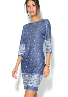 Короткое платье из мягко струящегося эластичного трикотажа украшено оригинальным принтом. Модель имеет классический круглый вырез, кокетку спереди и на спинке. Рукава 3/4 и нижний край с изящной отделкой. Длина около 86 см. Подходит для создания элегант...