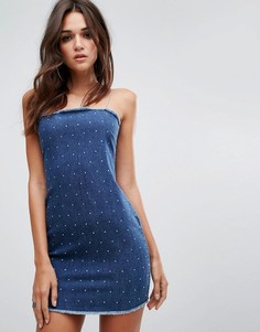 Платье от Jaded London, Эластичный хлопковый деним, Сплошная отделка стразами, В стиле бандо, Тонкие бретели с отделкой стразами, Необработанные края, Застежка на молнию сзади, Узкий крой, максимально облегающий тело, Машинная стирка, 98% хлопок, 2% эла...