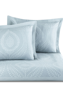 Покрывало изготовлено из жаккардовой ткани, подбито синтепоновым наполнителем и подкладом из однотонной ткани, простегано нитками. Широкий подворот края покрывала. В комплекте к покрывалу идут 2 декоративные стеганые наволочки на молнии размером 50х70.