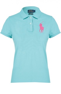 Синее облегающее поло из весенне-летней коллекции 2016 года украшено розовой вышивкой в виде логотипа бренда, основанного Ральфом Лореном. Изделие сшито из гладкого хлопка пике. Модель с отложным воротником и короткими рукавами застегивается на белые пу...