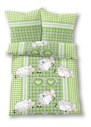 Это постельное белье внесет прекрасное настроение в Вашу спальню: милые овечки с цветами в лапках придают комплекту очаровательный вид. Красивый зеленый цвет освежит интерьер спальни.