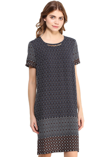 Прямое свободное платье из чистой вискозы подходит для повседневного гардероба. Лаконичный фасон с классическим круглым вырезом и короткими рукавами оттеняет эффектный комбинированный рисунок на ткани. Вырез декорирован минималистичным блестящим элемент...