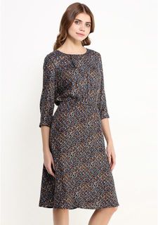 Свободное платье из струящейся вискозы с оригинальным рисунком. У круглого выреза заложена элегантная складка. Рукава 3/4 дополнены узкими манжетами с застежкой-пуговицей. Линия талии подчеркнута резинкой. Юбка до колена. Модель отлично сидит, искусно о...