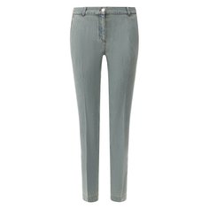 Завышенная талия, прямой крой, застежка на пуговицах спереди, контрастная строчка, классическая пятикарманная модель и петли для ремня.
