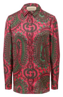 Команда бренда органично вплела монограмму GG, составленную из инициалов Гуччио Гуччи, в крупный растительный узор, украсивший разноцветную рубашку с отложным воротником. Модель с длинными рукавами изготовили из тонкого нежного шелка с характерным блеск...