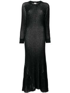 Черное ребристое платье от Loewe. Круглый вырез, длинные рукава, расклешенный силуэт, удлиненная модель.