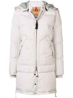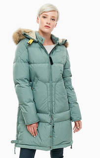 Серое удлиненное пуховое пальто с перьевым наполнителем и оторочкой мехом енотовидной собаки от Parajumpers.
