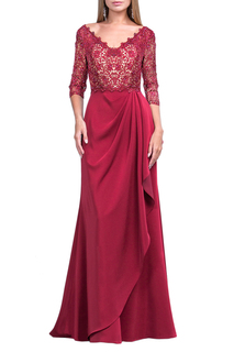Длинное вечернее платье из бордового джерси с люрексом. Короткий рукав, v-образный вырез. Платье идеально подчеркивает достоинства и скрывает недостатки фигуры женщин с пышными формами. Платье хорошо подходит для официальных приемов, юбилеев и балов.