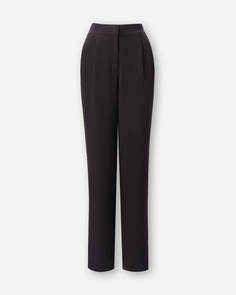 Черные брюки классического кроя с пришивным поясом и широкими штанинами. Спереди две небольшие складки. Сзади один прорезной карман. Застежка на пуговицу и молнию скрыта под планку. Состав: полиэстер; район; спандекс