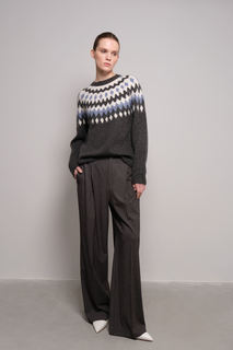 Серые брюки-палаццо в классическом стиле с мелким контрастным узором в полоску. Свободная модель со структурированными стрелками и защипами на талии. Застежка на молнию и пуговицу, шлевки для широкого ремня. Прорезные карманы сзади. Состав: полиэстер; ...