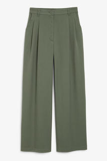Брюки с широкими штанинами, высокой посадкой и защипами спереди. Два кармана по бокам и два кармана-обманки сзади. Когда хочется надеть брюки и выглядеть нарядно!Высокая посадкаШирокие штаниныЗащипы спередиКосые передние карманыКарманы-обманки сзадиЗаст...