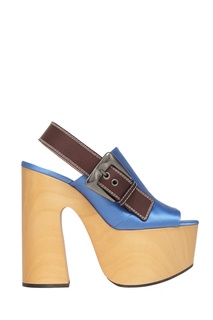 Босоножки на деревянной платформе из текстиля и кожи.