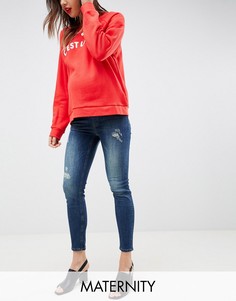 Супероблегающие джинсы для беременных Ridley от ASOS Maternity, Темно-синие выбеленные, Плотно облегающий фасон, Контурные задние карманы, визуально подтягивающие силуэт, Завышенная талия, Трикотажный пояс поверх живота, Зауженный крой, обеспечивающий п...