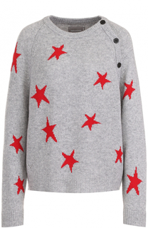Серый пуловер из коллекции сезона осень-зима 2017 года украшен крупными вязаными узорами в виде звезд. Модель с пуговицами на левом плече выполнена из ультрамягкой кашемировой пряжи с шелковистой текстурой. Широкий пояс и манжеты намеренно небрежно обра...