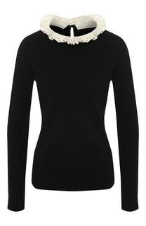 Темно-синий свитер из шерсти и шелка с кружевной вставкой и пуговицами от Alberta Ferretti.